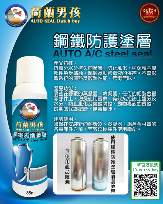 噴塗在隱蔽的蒸發器、冷凝器、任何的鋁製金屬零部件上,增長使用壽命,有效抗拒防止鹽分及水分,防止風化及鏽蝕腐蝕,動物毒液的侵蝕,長期的保護塗層,無毒無味。